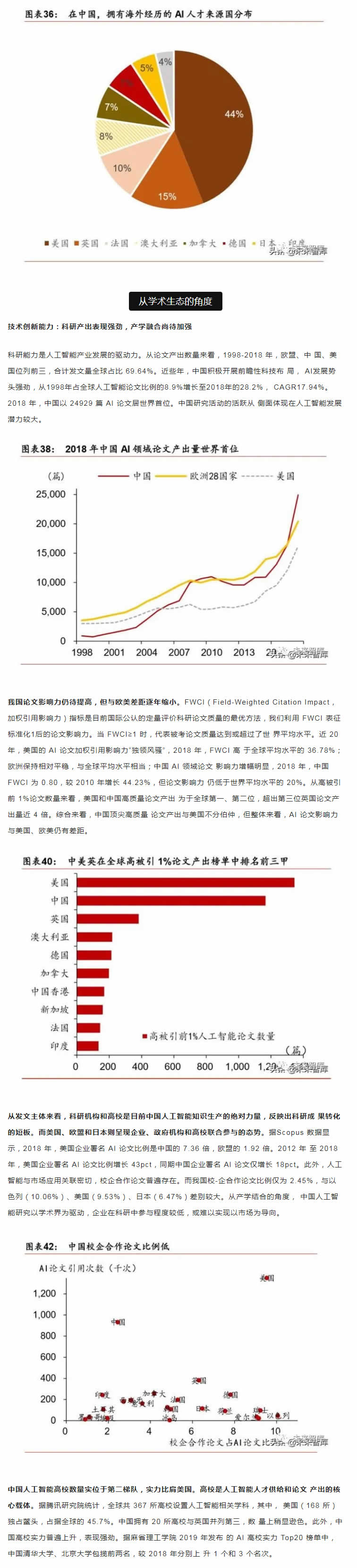 從中短期看,技術(shù)優(yōu)化、落地場景的開拓和滲透是是主要的增長點;從長期看,智能生 態(tài)體系建設(shè)才是彎道超車的必由之路。人工智能產(chǎn)業(yè)的核心競爭力在于生態(tài)體系的建設(shè), 包括大數(shù)據(jù)、算法理論、底層技術(shù)、應(yīng)用生態(tài)、人才儲備等層面。而我國人工智能產(chǎn)業(yè)生 態(tài)和基礎(chǔ)設(shè)施建設(shè)正處于探索期,如何實現(xiàn)核心技術(shù)的突破和拓寬人工智能技術(shù)與社會經(jīng) 濟融合場景著力點在于人才儲備和持續(xù)的研發(fā)投入。從人才的角度,收窄技術(shù)差距的根本 在于優(yōu)化人的知識結(jié)構(gòu)和能力。當前政策應(yīng)側(cè)重建立人才培養(yǎng)體系,為人工智能打造人才 資源池,尤其是在基礎(chǔ)學科L域突破人才瓶頸。同時,打破“唯數(shù)量論”的科研評價和考 核體系,改變?nèi)瞬偶顧C制勢在必行。我國人工智能專利申請和科研產(chǎn)出數(shù)量L先, 但質(zhì)量堪憂。唯有從源頭改變評價機制,才能扭轉(zhuǎn)“量多而質(zhì)優(yōu)”的問題。從研發(fā)的角度, 企業(yè)技術(shù)優(yōu)化和創(chuàng)新能力是解決產(chǎn)業(yè)痛點的關(guān)鍵。基礎(chǔ)研究的投入周期長、不確定性大、 和風險G特點決定了其難以短期內(nèi)獲得投資回報,但基礎(chǔ)L域的突破將為經(jīng)濟帶來長期和 廣泛的溢出效應(yīng),因此,國內(nèi)更應(yīng)關(guān)注底層技術(shù)的研發(fā)投入,扭轉(zhuǎn)傳統(tǒng)技術(shù)路徑,顛覆核 心技術(shù)受制于人的被動局面。此外,人工智能在賦能機器模擬人類進行決策的同時產(chǎn)生的 倫理道德、隱私保護和社會安全問題值得關(guān)注。由于法律法規(guī)存在滯后性,尚無法對人工 智能技術(shù)進行有效監(jiān)管。我國應(yīng)加快人工智能倫理研究,及早識別人工智能治理風險。