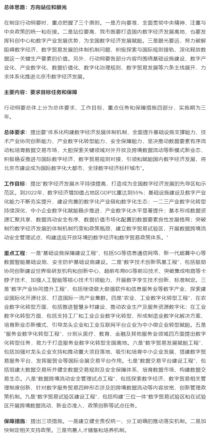 《北京市促進(jìn)數(shù)字經(jīng)濟(jì)創(chuàng)新發(fā)展行動(dòng)綱要(2020-2022年)》(以下簡(jiǎn)稱(chēng)《剛要》),經(jīng)北京市人民政府同意,相關(guān)部門(mén)于9月7日召開(kāi)了新聞發(fā)布會(huì)正式予以發(fā)布。